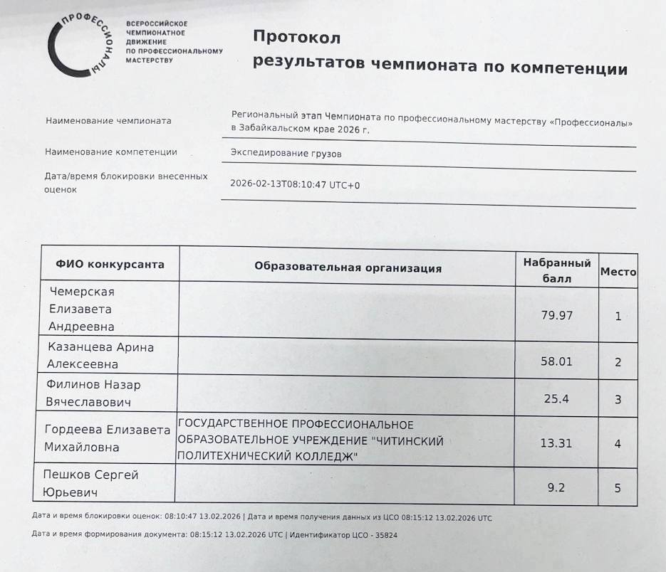В период с 10 по 14 февраля 2026 г. в Забайкальском крае прошел Региональный этап Чемпионата по профессиональному мастерству «Профессионалы». Наш колледж выступал организатором компетенции «Экспедирование грузов». Участниками чемпионата стали:
