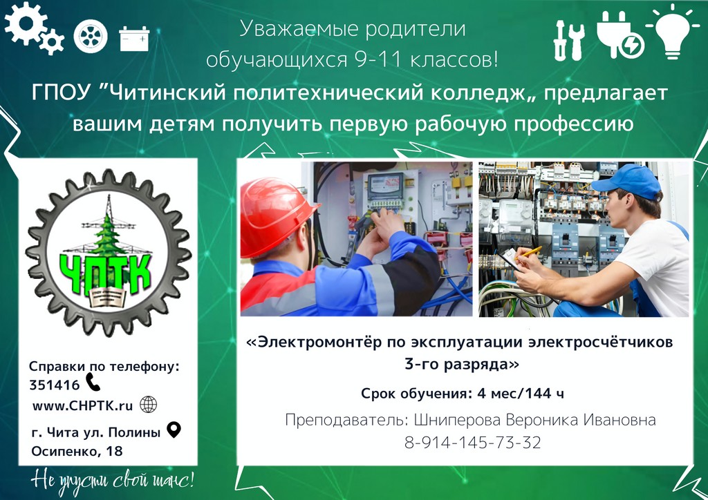 Уважаемые родители обучающихся 9-11 классов! ГПОУ "Читинский политехнический колледж" предлагает вашим детям получить первую рабочую профессию. Это отличная возможность начать свой профессиональный путь уже в школе...