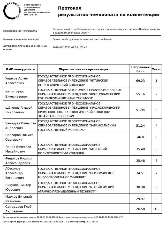 | 14 февраля 2026 г. в Забайкальском крае состоялось закрытие Региональный этап Чемпионата по профессиональному мастерству «Профессионалы». Участники выполняли конкурсное задание 15 часов, которое включало в себя 7 модулей: Модуль А «Система управления двигателем» Модуль Б «Электрические и электронные системы» Модуль В «Система рулевого управления, подвеска» Модуль Г «Тормозные системы» Модуль Д «Коробка передач (механическая часть)» Модуль Е «Двигатель (механическая часть)» Модуль Ж «Сборка электросхем» В Чемпионате принимали участие11 конкурсантов, следующих образовательных организаций: