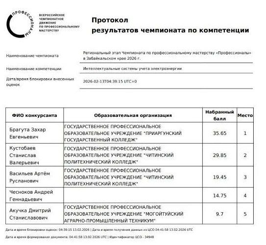 В период с 9 по 14 февраля 2026 г. в Забайкальском крае прошел Региональный этап Всероссийского чемпионатного движения по профессиональному мастерству «Профессионалы». Наш колледж выступал организатором компетенции «Интеллектуальные системы учета электроэнергии».