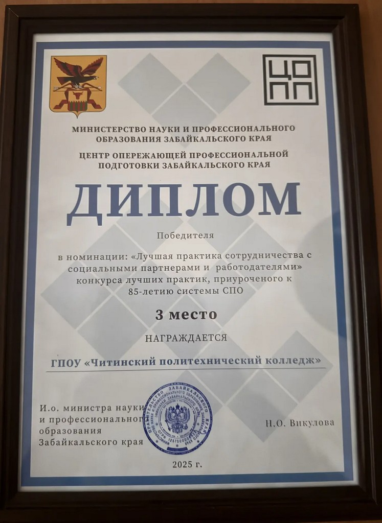 Подведены итоги регионального конкурса лучших практик образовательных организаций СПО по содействию занятости выпускников. Центр карьеры ГПОУ «Читинский политехнический колледж» занял почётное 3 место! На конкурс была представлена успешная практика энергетического отделения колледжа в номинации «Лучшая практика сотрудничества с социальными партнёрами и работодателями». Поздравляем коллектив энергетического отделения. Ваша системная и эффективная работа по построению партнёрства с филиалом ПАО «Россети Сибирь» – «Читаэнерго», создание современной учебно-производственной мастерской «Интеллектуальные системы учёта электроэнергии», приносит свои плоды. Это наглядный пример того, как тесная интеграция с ведущим работодателем региона обеспечивает:современную материально-техническую базу для обучения, востребованные компетенции у студентов, гарантированное трудоустройство.