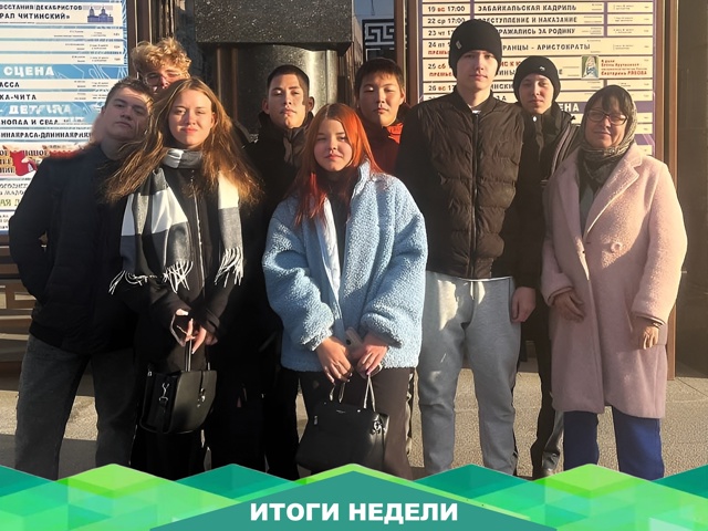 И, как всегда, дополняем событиями, о которых вы ещё не знаете: На концерте ансамбля «Забайкальские казаки» побывали участники хореографического коллектива «Русские узоры» во главе с Алёной Олеговной Вершининой. Наши артисты вдохновились особой атмосферой казачьей культуры. Теперь ждём от них новых концертных номеров. Долгожданное награждение участников чемпионата Забайкальского края по водному туризму состоялось. Две команды клуба «ВЕРТИКАЛЬ» показали достойные результаты. В командной гонке на дистанции спринт старожилы команды заняли первое место, в дисциплине слалом - третье место. Девушки-дебютантки стали третьими в спринте и слаломе. В общекомандном зачёте у наших команд второе и третье места. Группа ЛХ-14 с классным руководителем Еленой Николаевной Каберской совместила прогулку по скверам города с походом в кино. Получили полезные знания о кустарниках и деревьях и эстетическое удовольствие от кинофильма. С сотрудниками компании «Удоканская медь» встретились студенты 3 и 4 курсов энергетического отделения. Встреча прошла на площадке ЦОПП | Забайкальского края по инициативе Центра карьеры колледжа. Приобщились к миру театра студенты группы ТТ-35. С преподавателем Евгенией Анатольевной Кузнецовой они побывали на спектакле по пьесе «Гроза». Получили возможность дополнить свои впечатления от изученного на уроках литературы произведения Островского. Зрителями выступления музыкального ансамбля Восточного военного округа «Мы есть мы» стали студенты из общежитий колледжа. Глубокие и проникновенные песни, авторские стихи, выступления настоящих героев не оставили ребят равнодушными. Вечер пятницы студенты провели на благотворительном концерте «Русский Донбасс», организованном забайкальским бардом, участником СВО Константином Шлямовым. Собранные от концерта средства организатор направит на помощь бойцам-казакам. Сотрудники библиотеки колледжа провели исторический час «Во славу Отечества» для групп ТОиР-15, ТОиР-35. Студенты узнали подробности событий 1612 года, когда ополчение под предводительством Кузьмы Минина и князя Пожарского спасло Россию от польских интервентов. Татьяна Николаевна Рычкова, начальник отдела профилактики и пропаганды безопасности дорожного движения, во время встречи со студентами колледжа говорила о том, что безопасность на дороге – задача каждого участника дорожного движения. Съёмки с мест ДТП и примеры из практики работы заставили студентов сделать верные выводы из разговора. Урок мужества, посвященный параду в Москве на Красной площади 7 ноября 1941 года, посетили студенты групп СДМ-15 и ТОиР-35. Кадры военной хроники, рассказ ведущего, выступления артистов ОДОРА произвели сильное впечатление. Затем студенты прошли с экскурсоводом по залам военно-исторического музея.