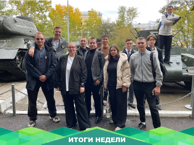 И ещё несколько запоминающихся событий: В День памяти забайкальцев, погибших при исполнении воинского и служебного долга, студенты колледжа провели митинг у мемориала участникам СВО. Минутой молчания почтили память наших выпускников, погибших во время спецоперации. Урок мужества, посвящённый Маршалу бронетанковых войск, дважды Герою Советского Союза Михаилу Катукову посетили первокурсники. Затем для них была проведена экскурсия по залам Военно-исторического музея ОДОРА. Вновь в Доме офицеров студенты побывали в пятницу, когда стали зрителями благотворительного концерта «Дети Забайкалья – Защитникам Отечества». Итоговая защита 5 волны проектов по использованию бережливых технологий состоялась на минувшей неделе. Свои проекты представили команды центра опережающей профподготовки и Красночикойского филиала колледжа. Осваивается в Курске, знакомится с коллегами и достопримечательностями города Наталья Сергеевна Тарасенко, финалистка конкурса «Мастер года». Она поделилась фотографиями с экскурсии на мемориал «Курская дуга». Посвящение в жильцы состоялось в общежитии №1. После весёлых испытаний девушки устроили дискотеку на открытом воздухе. Рады были и студентки, и юноши из общежития №2, и случайные прохожие. Для новых участников команды «Вертикаль» была проведена первая тренировка на природном ландшафте. Ребята отрабатывали наведение самосъёмной переправы, обучались вязке узлов, работе со снаряжением. «Вертикаль» приглашает новых участников в свою команду - присоединяйтесь! Группа РЗ-24 вместе с классным руководителем Татьяной Павловной Штадлер посетили парк ОДОРА. Во время тематической прогулки узнали об оружии и технике времен Великой Отечественной войны, о героях Забайкальского края. На экскурсии в картинной галерее побывали студенты группы ЭК-14 с классным руководителем Тамарой Геннадьевной Решетниковой. Сейчас там открыта выставка «Это все мое, родное!», и наши студенты увидели пейзажи, натюрморты, сюжетные картины художницы Галины Акопян. В завершающий день декады технологического отделения для студентов группы ЛХ-14 была организована встреча с ветераном лесной отрасли Григорием Фёдоровичем Климовым. Будущим коллегам учёный и писатель представил 3 книги об истории лесной отрасли в Забайкалье. Помогли провести встречу студенты группы ЛХ-12 и преподаватель Елена Николаевна Каберская.