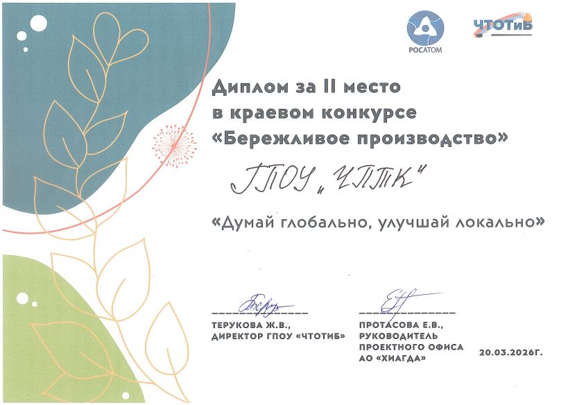 20 марта 2026 года на базе Читинского техникума отраслевых технологий и бизнеса состоялся краевой конкурс «Бережливое производство» среди студентов образовательных организаций среднего профессионального образования. Соорганизаторами мероприятия выступили представители АО «Хиагда», что подчеркнуло значимость и актуальность темы бережливого производства для региона.