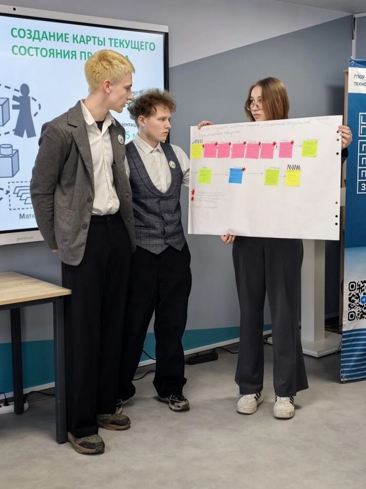 Второй этап прошёл в очном формате и включал два задания. Сначала студенты продемонстрировали свои теоретические знания, пройдя тестирование по дисциплине «Основы бережливого производства». Затем им предстояло решить практическую задачу — построить карту текущего состояния процесса, проявив аналитические способности и умение работать в команде.