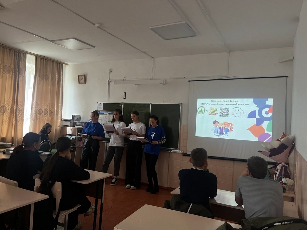 В рамках Единого дня открытых дверей в кластерах федерального проекта "ПРОФЕССИОНАЛИТЕТ" 10 и 15 октября командой Амбассадоров "Профессионалитета" Красночикойского филиала ГПОУ "ЧПТК" были организованы классные часы для учащихся 8-11 классов МОУ Красночикойская СОШ и МОУ Красночикойская СОШ № 2.