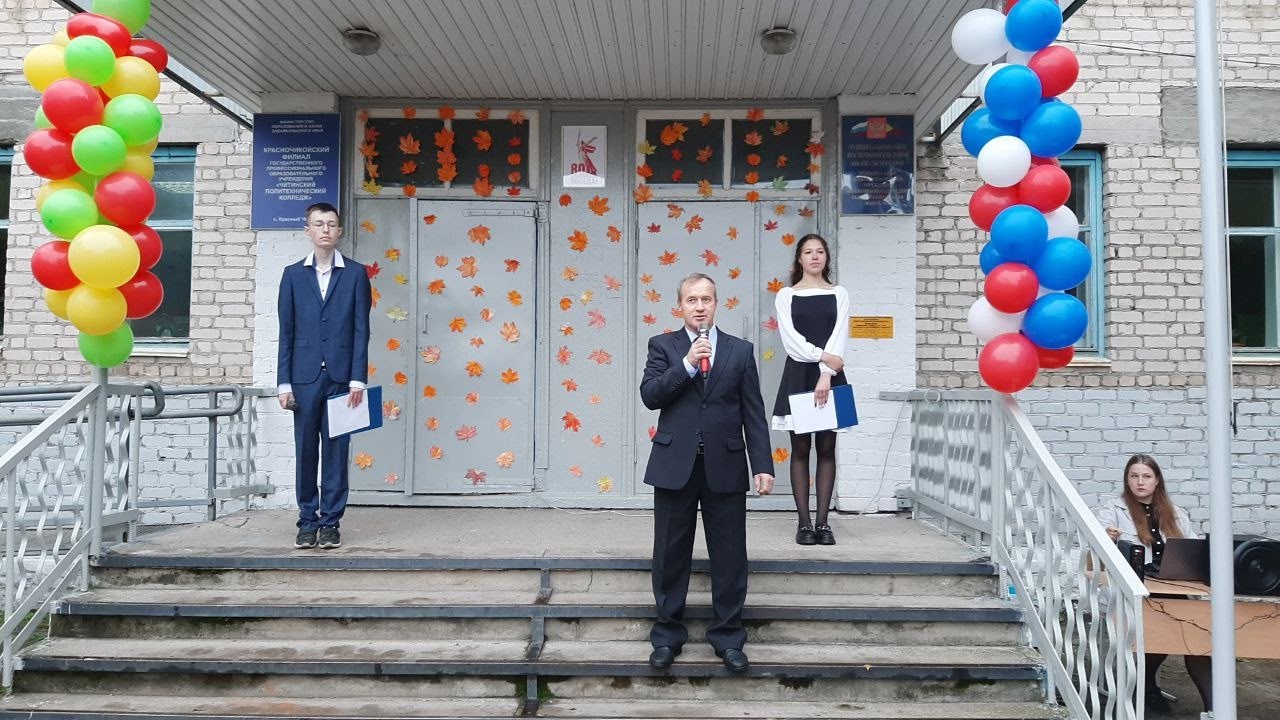 Торжественное поднятие флага Российской Федерации в Красночикойском филиале ГПОУ «ЧПТК» предоставилось самым активным студентам филиала колледжа Полине Селивановой и Матвею Ведерникову. Слова поздравления студентам и преподавателям прозвучали от заместителя директора по АХ и УПР Линейцева Александра Ивановича.