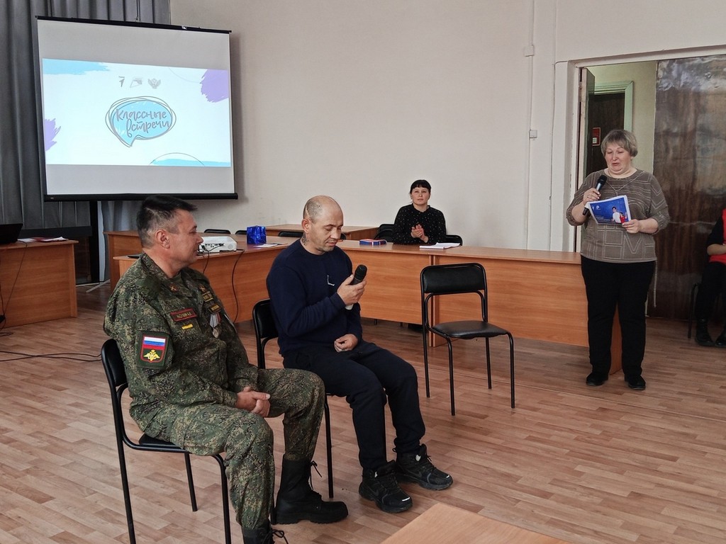 Акция прошла в формате – "Классной встречи" с участниками Специальной военной операции: Насухиным Анатолием Иннокентьевичем и Васильевым Леонидом Анатольевичем. Наши герои, настоящие примеры мужества и отваги, пришли поделиться своим бесценным опытом и знаниями с молодым поколением.