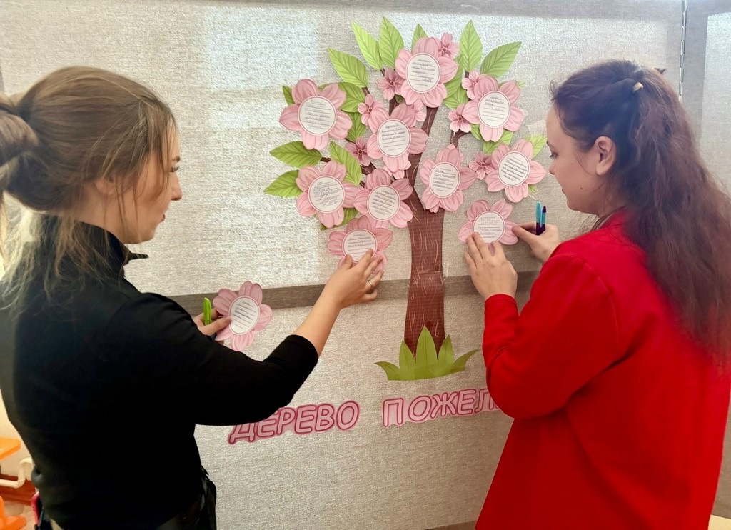На протяжении всего дня в холле колледжа расцветало необычное дерево — «Дерево пожеланий». Студенты с огромным удовольствием прикрепляли к нему листочки со своими самыми добрыми и искренними словами. Это «дерево» стало настоящим символом единства и тепла: каждый комплимент и каждое пожелание грели душу и вызывали улыбки на лицах наших дам!