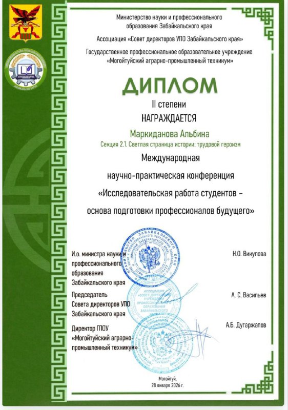 Группа преподавателей и студентов Читинской области приняла участие в значимом научном мероприятии — Международной научно-практической конференции «Исследовательская работа студентов – основа подготовки профессионалов будущего», организованном Могойтуйским аграрно-промышленным техникумом.