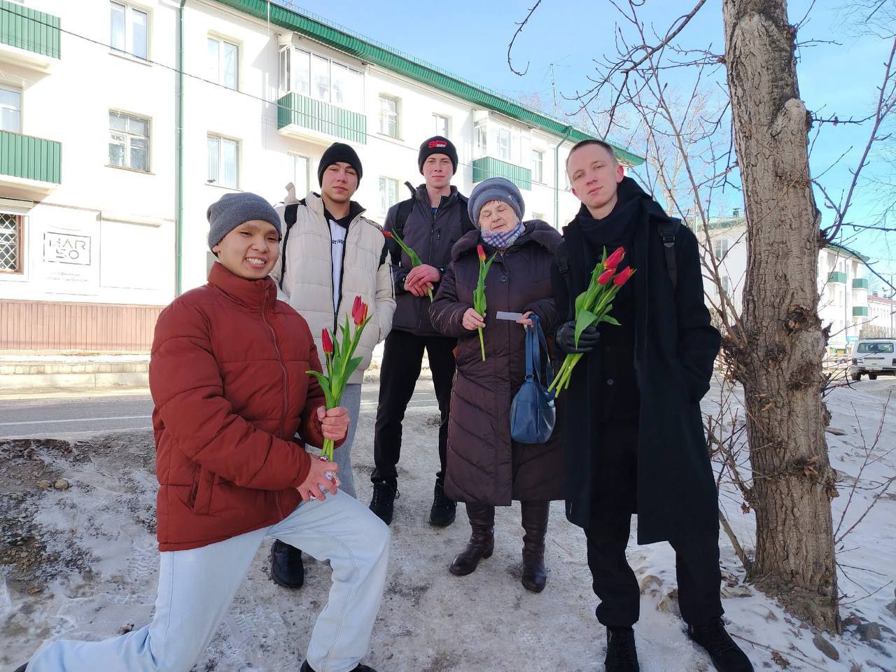 Ребята отправились по улицам нашего города Петровск-Забайкальский, чтобы поздравить женщин и девушек с наступающим праздником! 🎉 Они дарили тюльпаны 🌷, открытки 📬 и искренние пожелания счастья, здоровья и любви.