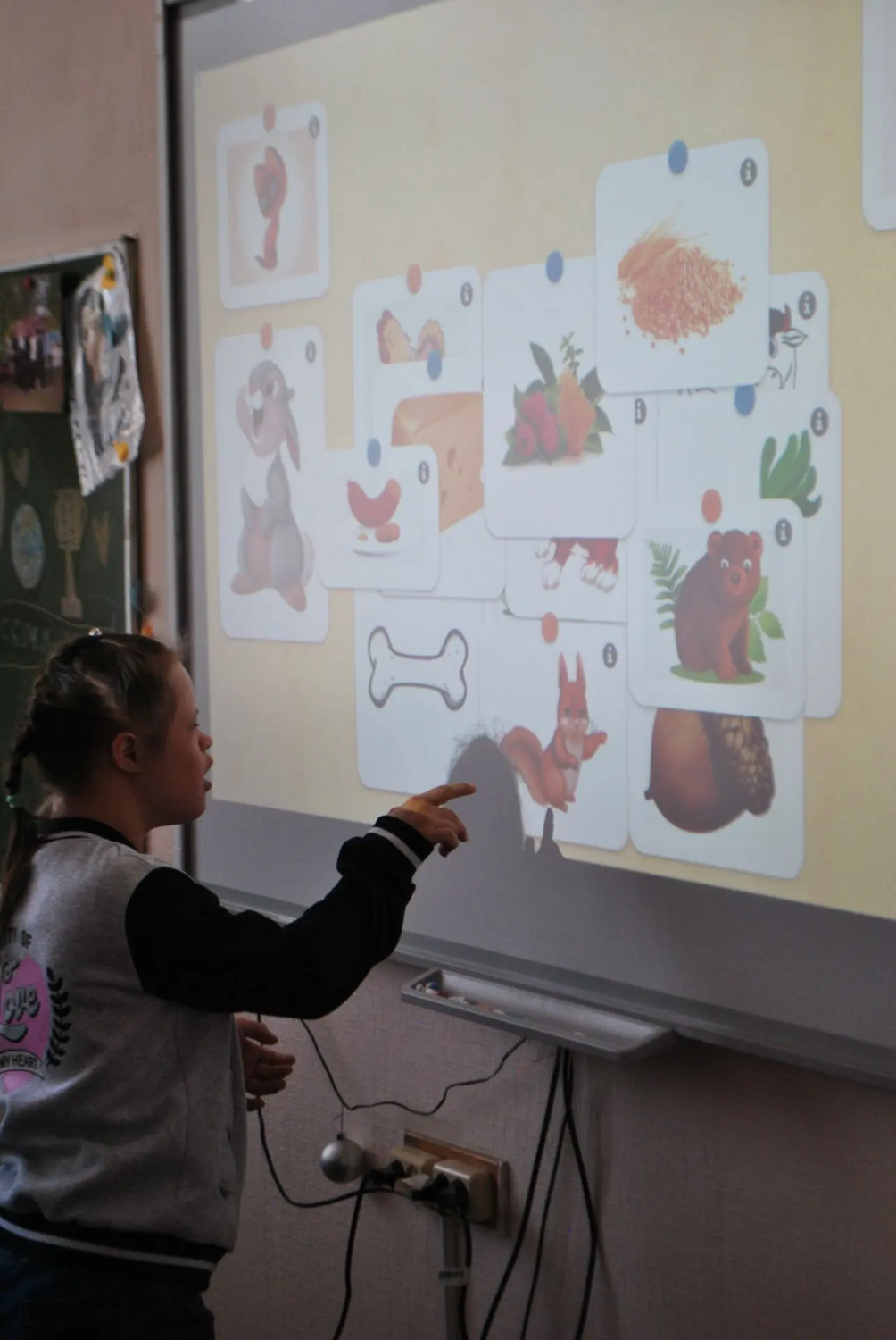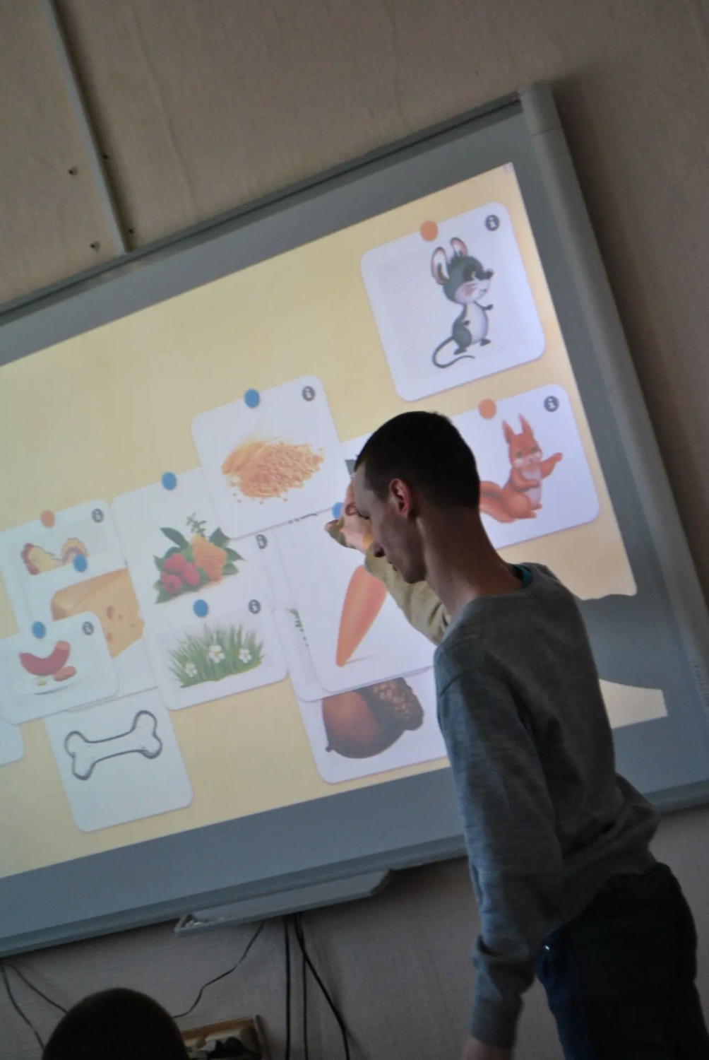 Начали с повторения теории — обучающиеся вспомнили, чем питаются животные, и закрепили материал с помощью интерактивного задания на доске. Такой подход помог быстро включиться в работу и настроиться на дальнейшую деятельность.